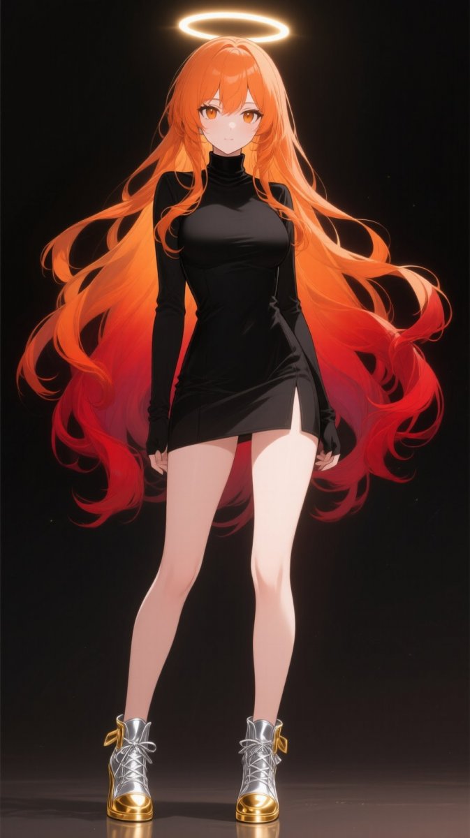#5 anime character, long wavy orange hair with red gradient, black turtleneck, glowing halo, shoes with golden accessories, silver colors palette #anime_lora