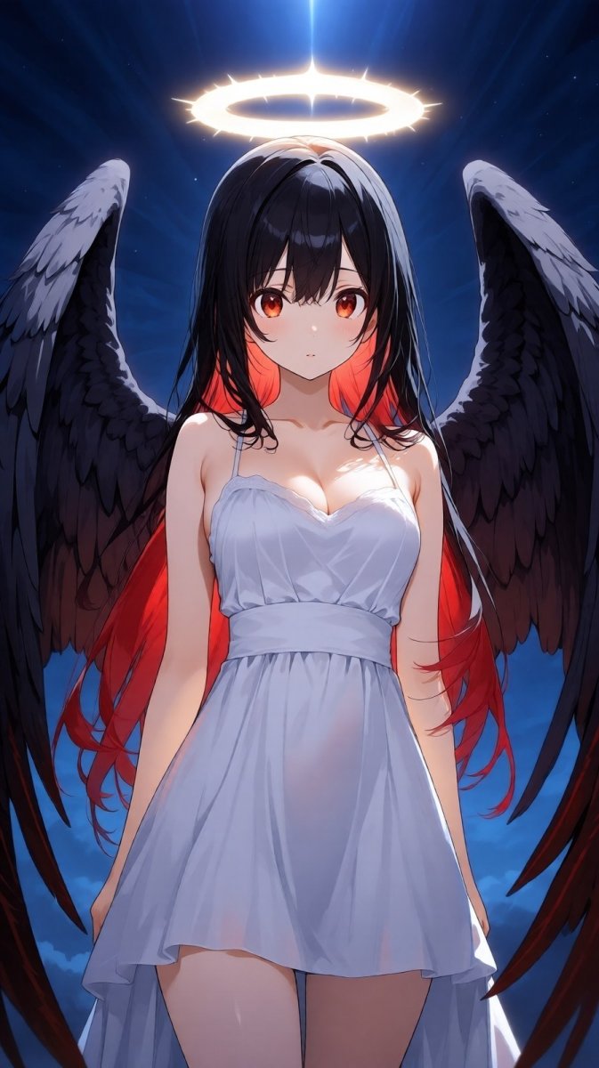 #5 <lora:1914845:1.2>, anime, illustration, angel girl, black and red hair, white dress, dark wings, glowing halo, soft lighting, dreamy feel, navel, solo #anime_lora