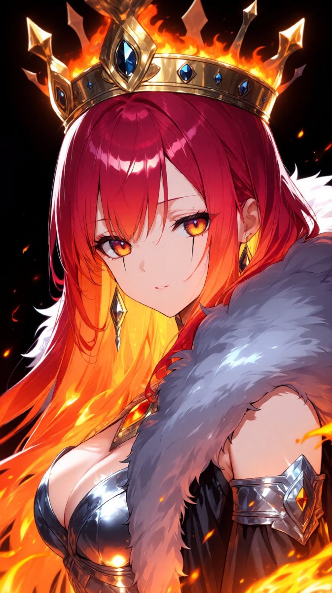 #3 <lora:1914845:1.2>, anime, illustration, fire queen with red gradient hair and golden crown, luminous clothes, close-up portrait, extra fur mantle, silver colors palette, piercing eyes #anime_lora