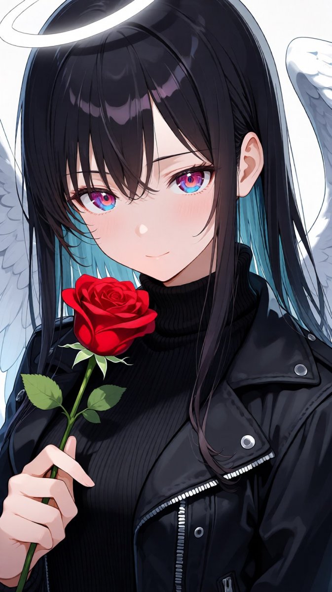 #5 <lora:1914845:1.2>, anime, illustration, angel girl with long hair and vibrant eyes holding a red rose, black turtleneck jacket, ethereal atmosphere, gray and white patterns, piercing eyes #anime_lora