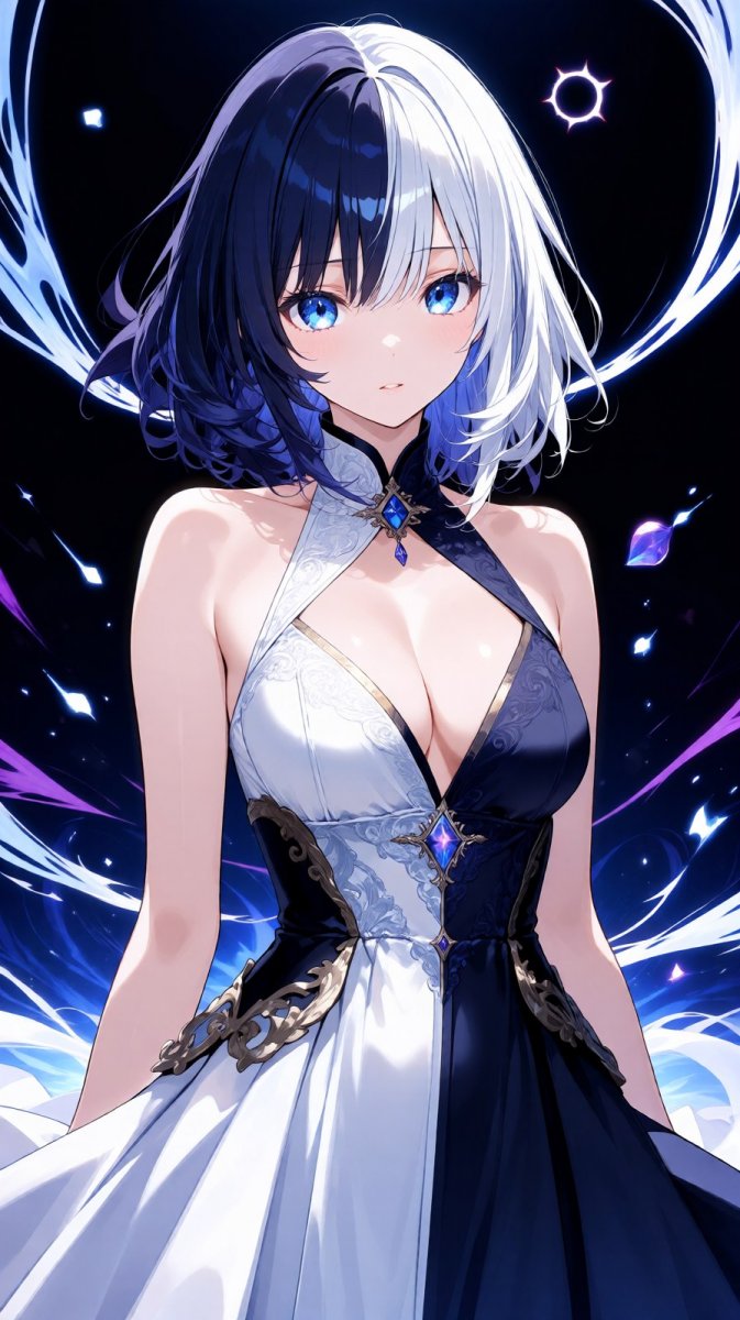 #3 <lora:1914845:1.2>, anime, illustration, girl with vibrant dark and white hair, elegant dress split between light and dark, piercing gaze, surrounded by a mystical energy, surreal elements #anime_lora