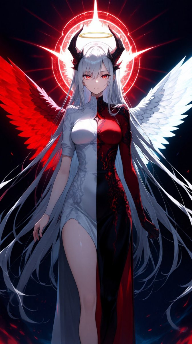 На изображении, сгенерированном нейросетью Qwen images Ai, представлена девушка, воплощающая в себе противоречивое сочетание ангельского и демонического начал. Её крылья окрашены в огненно-алые и цвета слоновой кости, а взгляд полон таинственной силы и пронзительности. Вокруг головы персонажа формируется сложное сияние света и тени, создающее атмосферу мрачности и потусторонней красоты. Стиль изображения напоминает аниме, с детальной проработкой черт лица и акцентом на выразительность. Цифровая живопись придает работе глубину и реалистичность, подчеркивая контраст между чистотой ангельской сущности и хаотичной энергией демонической силы.