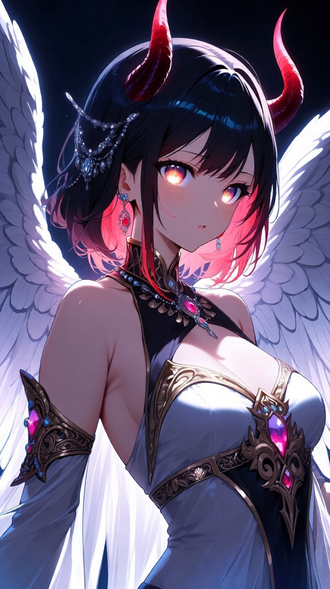 #4 <lora:1914845:1.2>, anime, illustration, character with glowing eyes, harmonic fusion of angel and demon attire, intricate jewelry, soft lighting, duality theme #anime_lora