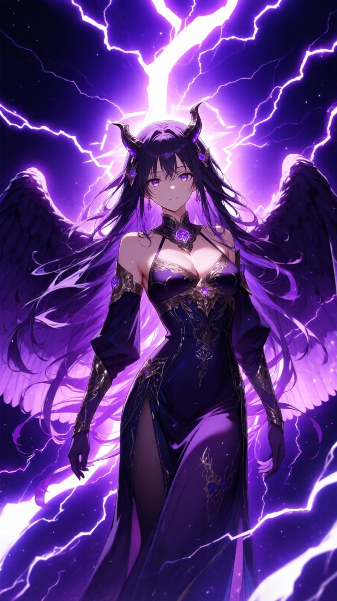 #2 <lora:1914845:1.2>, anime, illustration, celestial being with a mix of angelic and demonic features, purple lightning in background, long flowing hair, dramatic lighting, heavenly glow #anime_lora