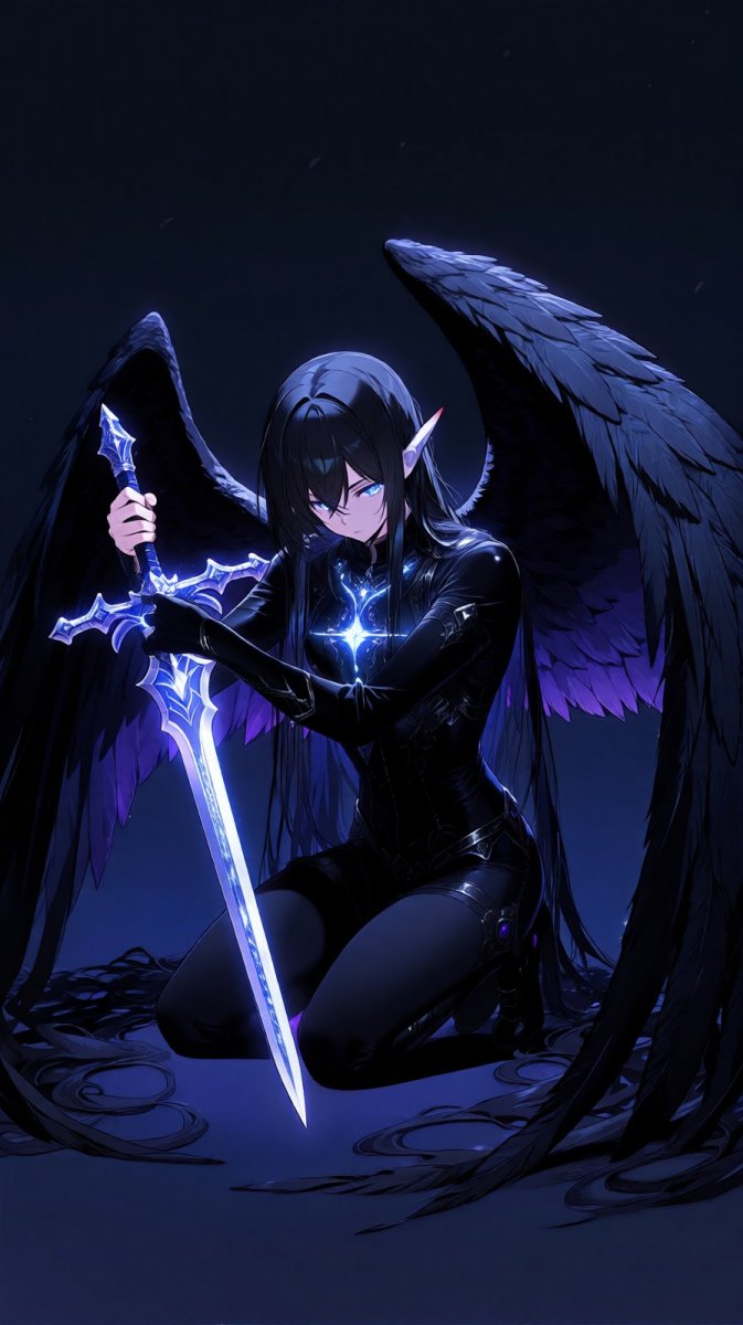#5 <lora:1914845:1.2>, anime, illustration, fallen angel kneeling, black feathered wings, gripping a magnificent sword, luminous darkness, ethereal details #anime_lora