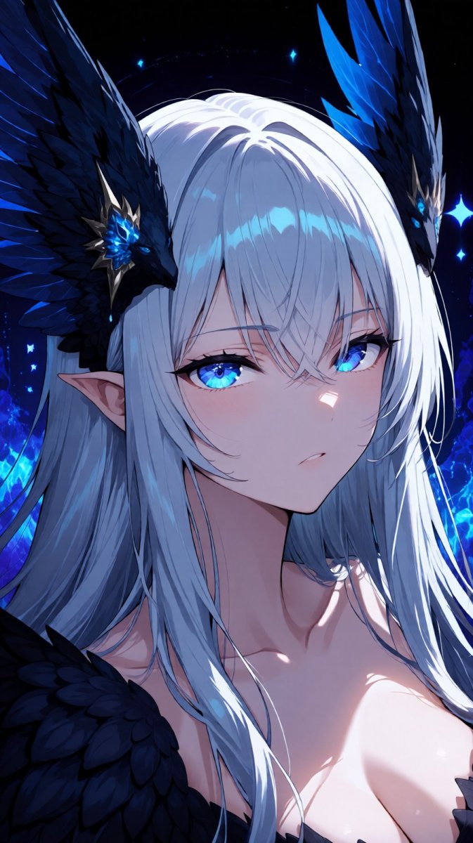#5 <lora:1914845:1.2>, anime, illustration, beautiful figure with a contrasting color palette of light and darkness, fierce yet serene expression, detailed wings, unique eye color, mystical background #anime_lora