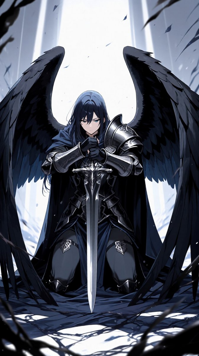 #4 <lora:1914845:1.2>, anime, illustration, warrior angel in a kneeling position, black wings wrapped around, sword on the ground, intense gaze, dark fantasy #anime_lora