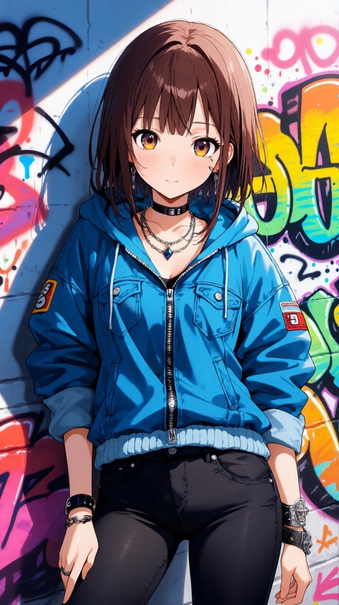 #3 <lora:1914845:1.2>, anime, illustration, girl in a casual outfit with piercing eyes, denim jacket, stylish accessories, leaning against a wall, relaxed pose, colorful graffiti #anime_lora