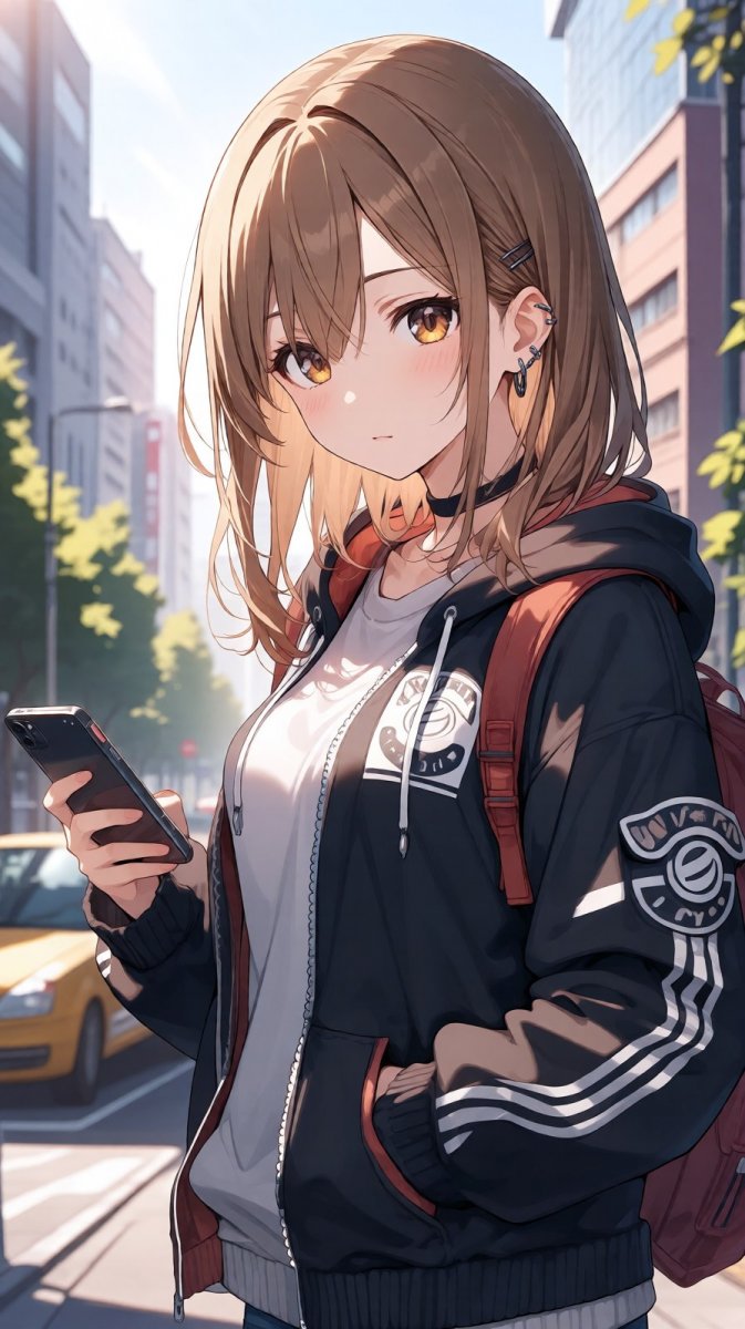 #2 <lora:1914845:1.2>, anime, illustration, casual girl with piercing eyes, light brown hair, streetwear fashion, holding a smartphone, soft sunlight, urban landscape #anime_lora
