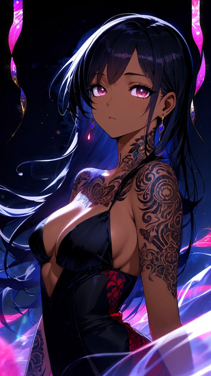 #2 <lora:1914845:1.2>, anime, illustration, intricate tattoos, ethereal atmosphere, dark-skinned female, wearing a black and red dress, glowing eyes, digital art elements #anime_lora