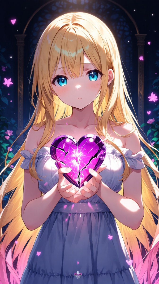 #2 <lora:1914845:1.2>, anime, illustration, girl with long blonde hair, holding a shattered heart, vibrant colors, intricate details, melancholic look, enchanting scenery #anime_lora