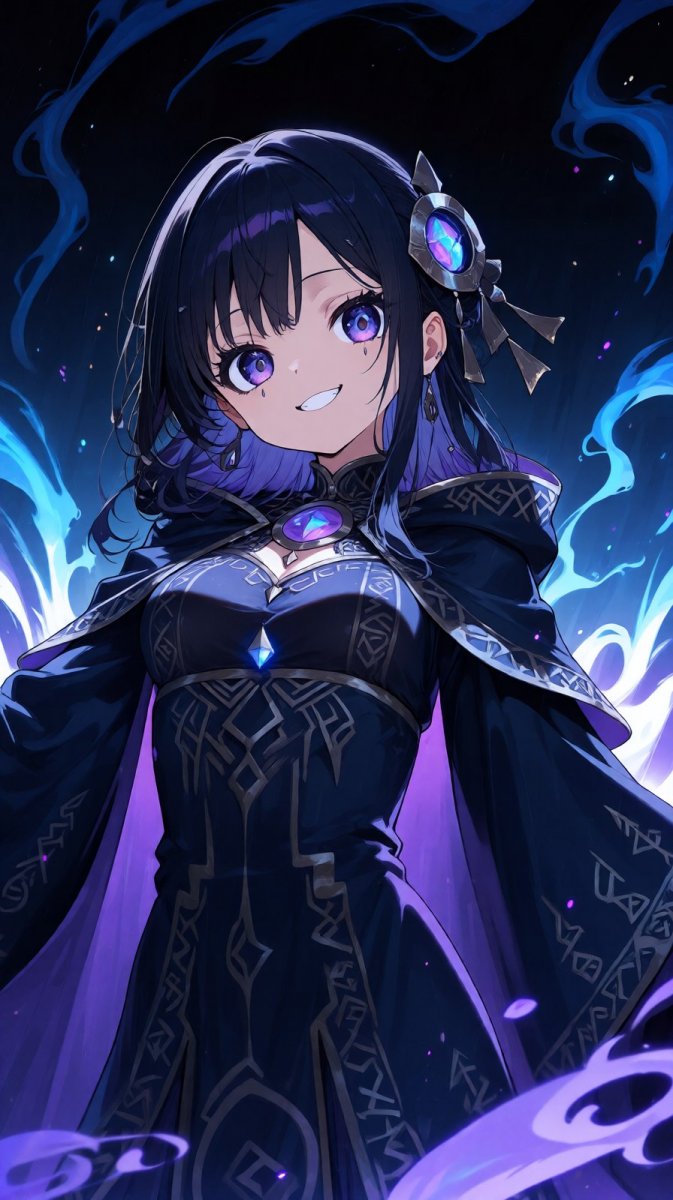 #1 <lora:1914845:1.2>, anime, illustration, big piercing eyes, 1girl, (necromancer|shamaness), donning a flowing robe adorned with ancient runes, surrounded by swirling shadows and ethereal wisps, her face displaying a (mischievous|sassy) smirk, as she commands the spirits of the night, creating an aura of mystery and enchantment, 😏.