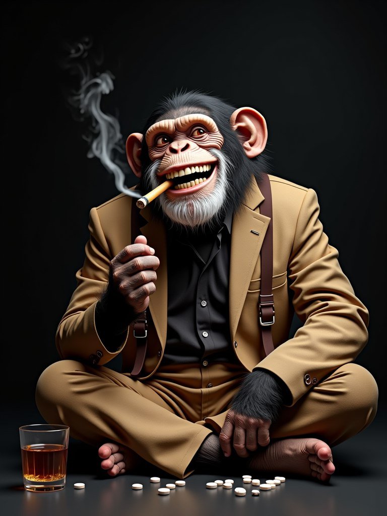 Завораживающий гиперреалистичный портрет антропоморфного шимпанзе средних лет, словно сошедшего со страниц фантастической сатиры или голливудского фильма нуар. Обаятельная обезьяна, облаченная в безупречный бежевый костюм с коричневыми подтяжками, примостилась на темной поверхности перед бездонным черным фоном. Его лицо украшает седая окладистая борода, а широкая улыбка демонстрирует ряд белоснежных зубов, выдавая его довольство и легкую задорность. В правой руке он небрежно держит горящую сигару, от которой в воздух поднимаются изящные клубы дыма, добавляя сцене нотку расслабленности и таинственности. Рядом с ним стоит небольшой стакан с темной жидкостью, предположительно виски, а вокруг разбросаны таблетки и другие загадочные предметы, намекающие на сложную жизнь и скрытые истории. Мощное освещение подчеркивает детализацию морды, создавая драматические тени и яркие блики, акцентирующие внимание на выразительных глазах, полных веселья и хитрости. Цветовая гамма выдержана в теплых коричневых и бежевых тонах с контрастными акцентами от дыма сигары и содержимого стакана, формируя гармоничную и запоминающуюся композицию. Это не просто изображение – это погружение в мир фантазии, где животное обретает человеческие черты, а привычные предметы приобретают новое значение, вызывая улыбку и заставляя задуматься о границах реальности и вымысла. Портрет пронизан атмосферой безмятежности, юмора и легкой иронии, приглашая зрителя присоединиться к этому необычному и увлекательному миру