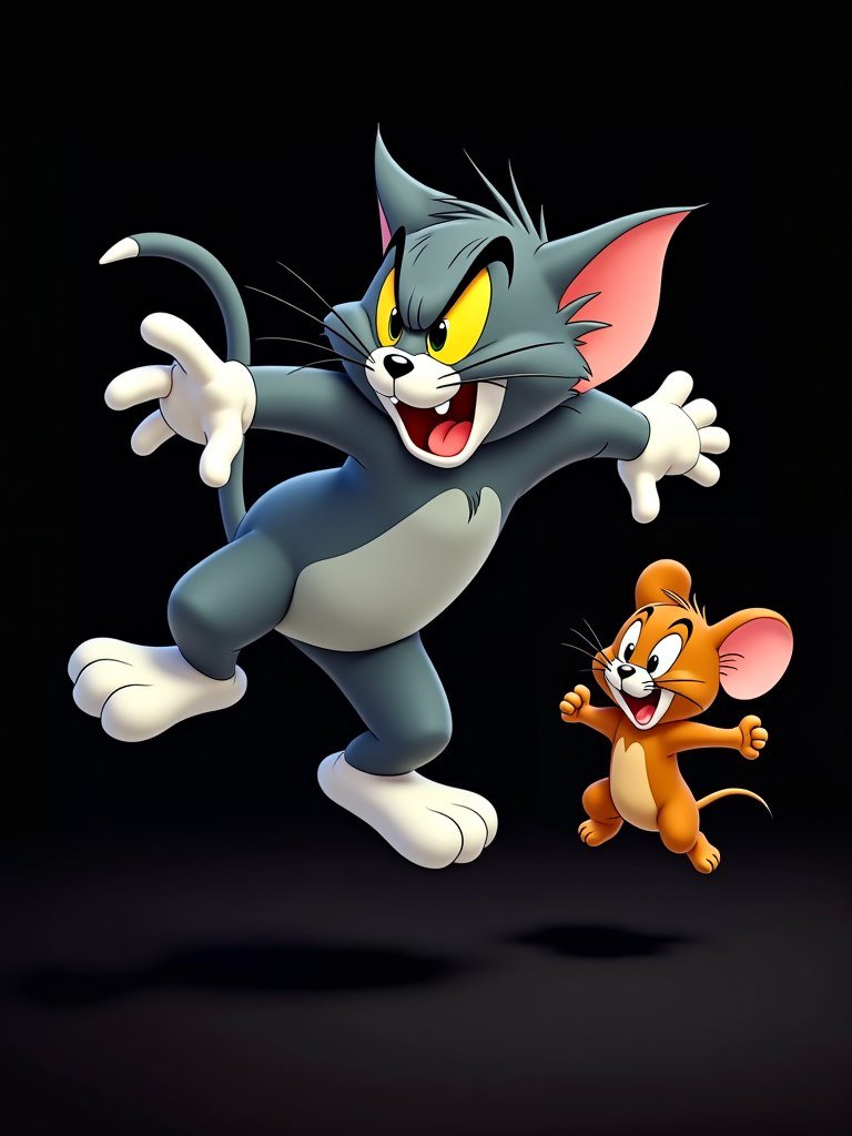 Захватывающая сцена погони с любимыми героями мультфильмов Томом и Джерри. На изображении запечатлен Том, крупный антропоморфный кот, в момент прыжка, его тело вытянуто в стремительном преследовании Джерри. Детализированная текстура шерсти Тома выполнена в реалистичном стиле с преобладанием серого цвета и переходом от светлых до темных оттенков, создающих эффект объема и глубины. Выражение морды кота – свирепое: открытый рот демонстрирует зубы, а взгляд полон агрессии и гнева. Джерри, маленький мышонок, запечатлен в движении с выражением неподдельной радости на мордочке. Его шерстка светло-коричневого цвета имеет схожую текстуру с шерстью Тома, обеспечивая четкий контраст между персонажами. Фон выполнен в виде насыщенного черного цвета, что акцентирует внимание на героях. Использование направленного освещения создает блики на шерсти и подчеркивает динамику происходящего. Композиция построена по диагонали, что усиливает ощущение погони и стремительности действий. Стиль изображения сочетает в себе иллюстративность и мультяшность с кинематографической подачей. Общая атмосфера наполнена энергией, игривостью и легкой комичностью, передавая дух культового мультфильма. Это яркий пример динамичного действия, мастерски переданного через детализированное изображение двух неподражаемых персонажей
