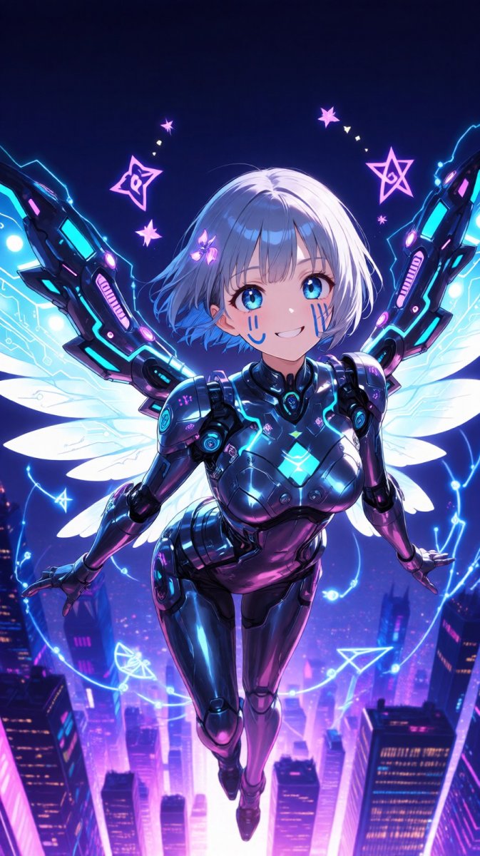 Завораживающая иллюстрация в стиле аниме представляет собой девушку-киборга или фею с огромными пронзительными глазами. Её тело сочетает в себе элементы магии и передовых технологий – это проявляется в металлических крыльях, украшенных светящимися схемами, на которых она изящно парит над неоновым мегаполисом. Окружающий городской пейзаж подсвечен яркими огнями, создавая контраст с мистической атмосферой вокруг героини. На её лице играет игривая, немного дерзкая улыбка, а вокруг рук мерцают признаки колдовства, будто она плетет заклинания прямо среди небоскребов. Это изображение – гармоничное сочетание фантазии и футуризма, демонстрирующее необычную красоту и силу персонажа, который словно соединяет два разных мира в единое целое. Вся сцена пронизана энергией и динамикой, а эмоция на лице девушки добавляет образу живости и привлекательности. Она выглядит одновременно могущественной и беззаботной, способной управлять как технологиями, так и магией. Кажется, что этот персонаж – воплощение мечты о будущем, где магия и наука не противоречат друг другу, а дополняют и усиливают друг друга