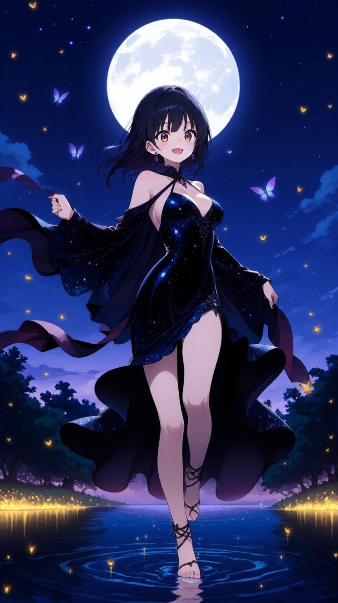 2. <lora:1914845:1.2>, anime, illustration, big piercing eyes, 1girl, (vampiress|sylph), draped in a flowing gown that shimmers like the night sky, a playful 😜 expression as she dances on the edge of a moonlit lake, with ethereal fireflies illuminating her pathway, embodying mystery and allure as she flits between dreams and shadows.