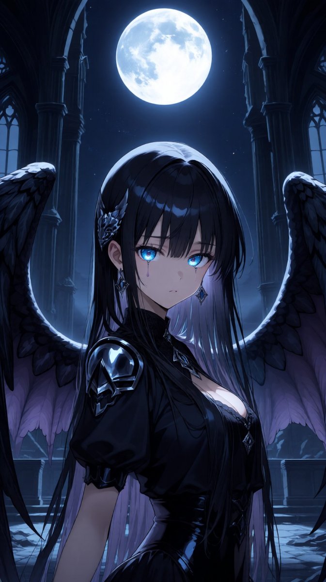 1. <lora:1914845:1.2>, anime, illustration, big piercing eyes, 1girl, (fallen angel|wyvern), with shimmering ebony wings and a hauntingly beautiful visage, standing in a ruined cathedral under moonlight, her eyes radiating a mix of sorrow and malice, a hint of a 😟 expression as she reflects on her lost grace, surrounded by echoes of a forgotten past.