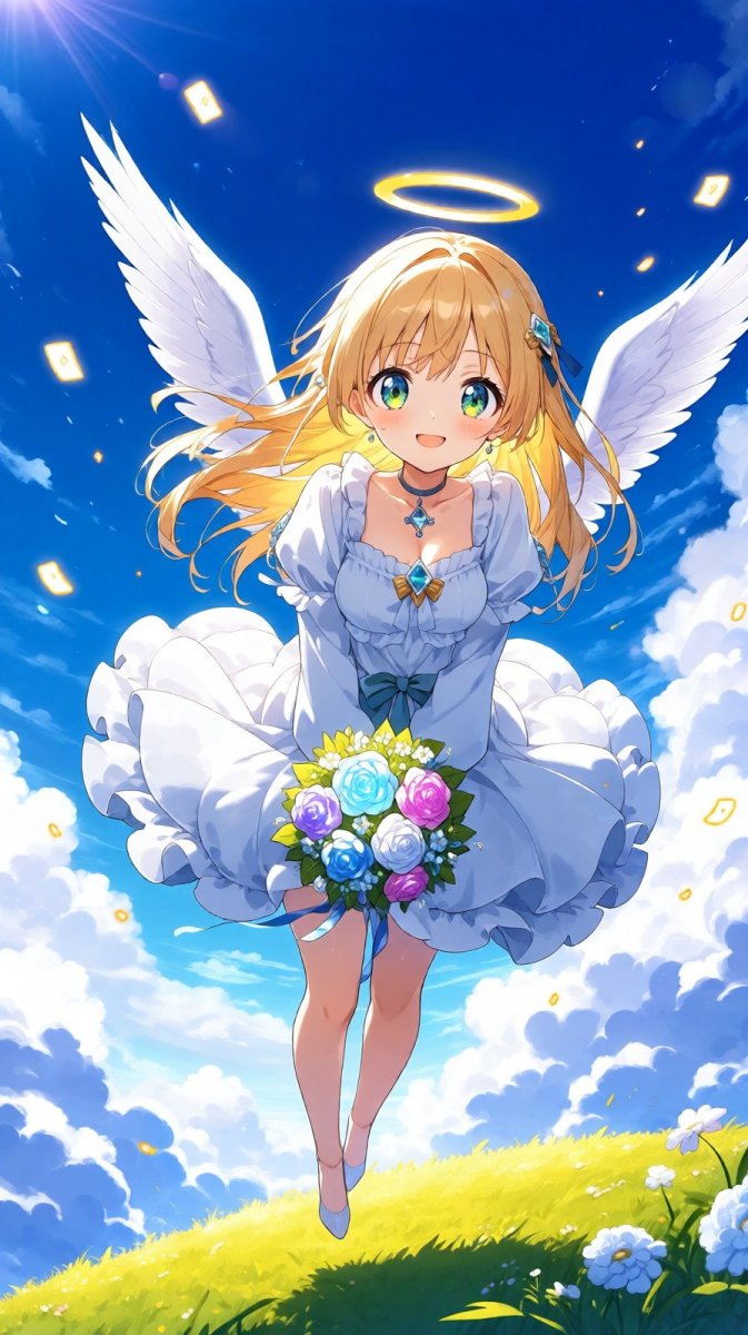 #5 <lora:1914845:1.2>, anime, illustration, big piercing eyes, 1girl, (archangel|fey), gracefully descending from the clouds with a bouquet of iridescent flowers, her (joyful|radiant) smile lighting up the scene, as all the creatures of the meadow look up in awe, celebrating her kindness and beauty, 😁.