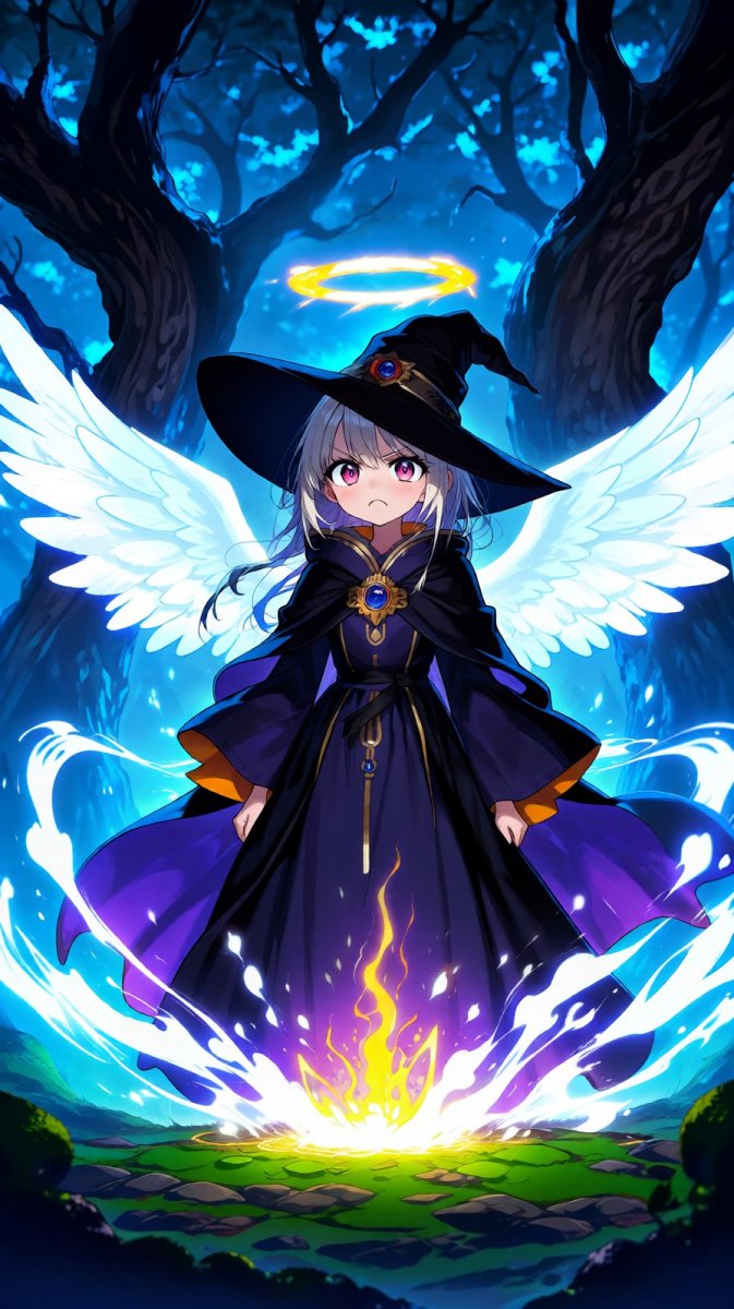 3. <lora:1914845:1.2>, anime, illustration, big piercing eyes, 1girl, (witch|archangel), standing under a canopy of ancient trees, her vibrant robes swirling around her as she conjures magic from the earth, sporting a determined 😠 look, with subtle angelic wings glowing faintly behind her, merging nature's power with celestial grace.