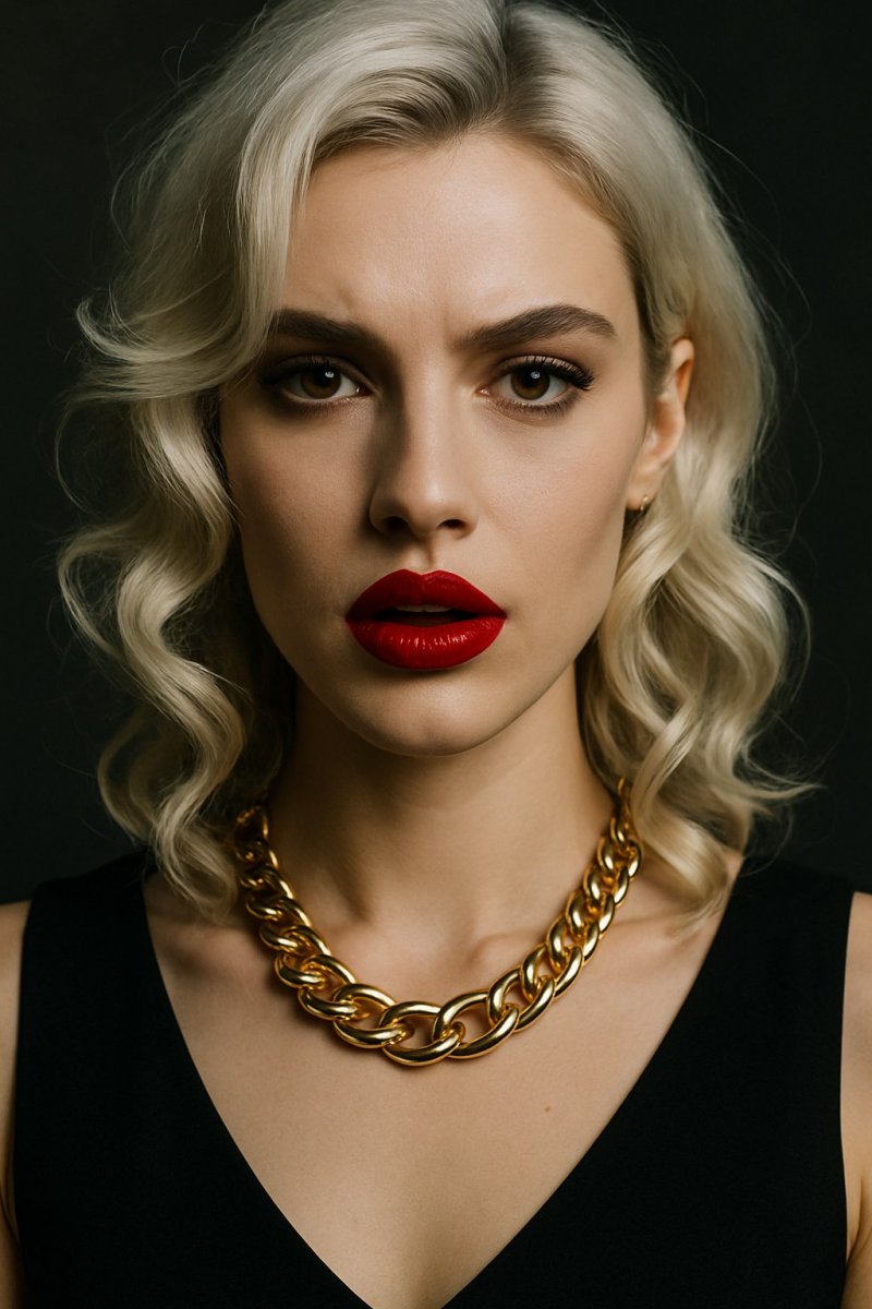 #1. portrait of a woman, pretty face, red lipstick, black dress, white hair styled in loose curls, gold chain necklace, close-up of mouth with lips slightly parted, dramatic and intense mood #role_red