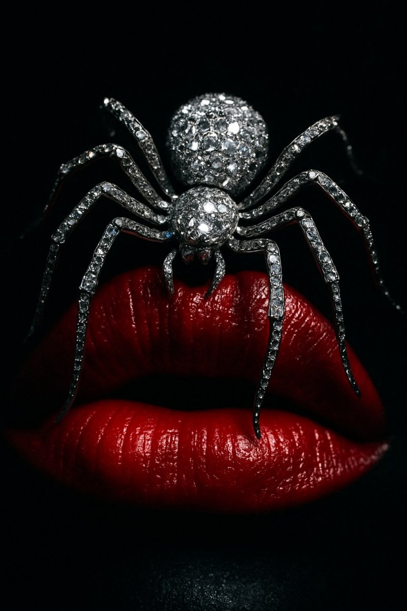 #1. close-up of metallic spider, encrusted with diamonds, perched on red lips, shimmering against a black background, overall mood dark and mystical. #role_red