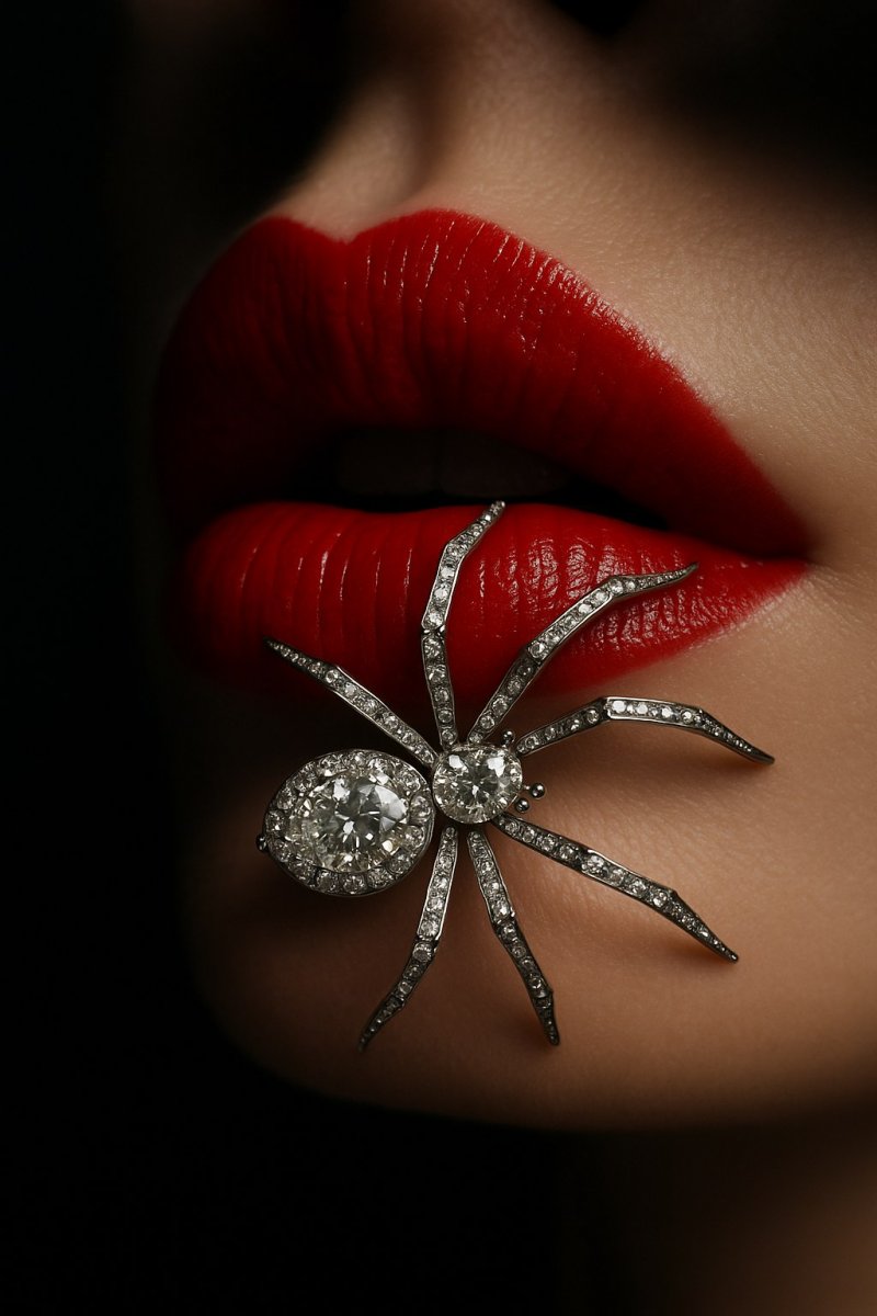 #5. high-quality image of a woman's lips painted bright red, adorned with a delicate diamond-encrusted metallic spider, captivating aura with blurred dark backdrop. #role_red
