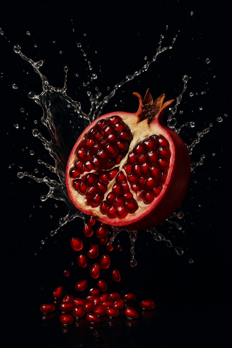 #4. hyper realistic, photorealistic image of pomegranate cut in half, with seeds spilling out and dynamic water splashes against a contrasting black BG, capturing the freshness and vitality of the fruit #role_food
