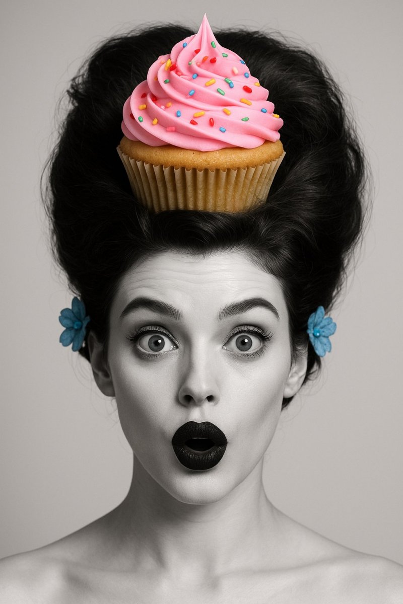 Необычный портрет молодой женщины, запечатлённый в монохромной гамме, излучает игривое настроение и лёгкую абсурдность. В центре внимания – её лицо с выразительным удивлением, обращённое прямо на зрителя. Главная деталь композиции – огромный шоколадный капкейк, эффектно водружённый на причёсе. Розовый крем, покрывающий выпечку, украшен ярким разноцветным дождём из посыпки, создавая визуальный акцент и добавляя образу сказочности. Тёмная помада подчёркивает чувственность, а пышная укладка волос, декорированная крошечными голубыми цветами с обеих сторон головы, придает образу элегантности и завершенности. Фон нейтральный, однотонный, что позволяет полностью сосредоточиться на модели и её экстравагантном головном уборе. Вся фотография пронизана духом юмора и фантазии, предлагая зрителю окунуться в мир лёгких грёз и безграничной креативности. Это не просто портрет, это забавный перформанс, отражающий позитивное отношение к жизни и умение находить радость в мелочах. Фотография вызывает улыбку и дарит ощущение праздника, словно приглашая зрителя присоединиться к весёлому безумству этого момента. Игра света и тени добавляет глубины изображению, делая его ещё более привлекательным и загадочным