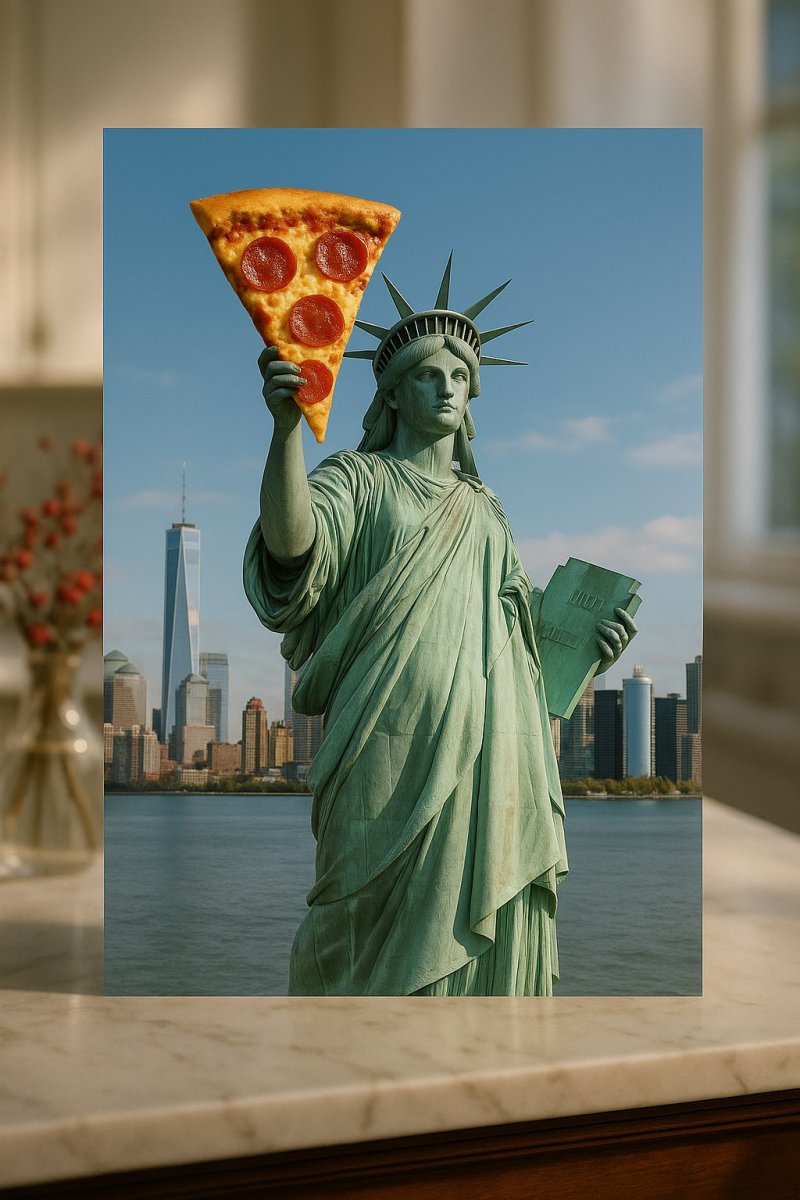 Свобода и пицца: неожиданное сочетание в современном городе. Генерация из нейронной сети Sora Ai Images