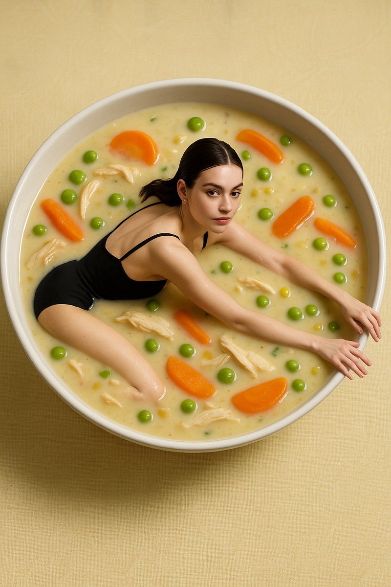 В центре изображения – юная девушка, плавно скользящая в большой чаше ароматного куриного супа. Бульон густой и сливочный, создающий ощущение тепла и уюта. В супе видны кусочки нежного куриного мяса, а также яркие овощи: морковь и горошек, добавляющие аппетитной детализации. Картина излучает легкость и игривость, вызывая чувство беззаботности и улыбку.