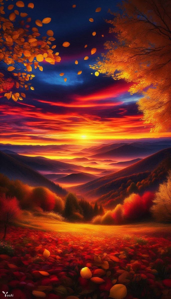Изображение, созданное нейросетью Dalle 3, передает атмосферу осени и уходящего дня. Закат окрашивает небо в яркие огненные цвета, словно напоследок даря миру красоту. Приближающаяся ночь окутывает пейзаж спокойствием и таинственностью, создавая ощущение перехода от теплого времени года к прохладе и тишине.