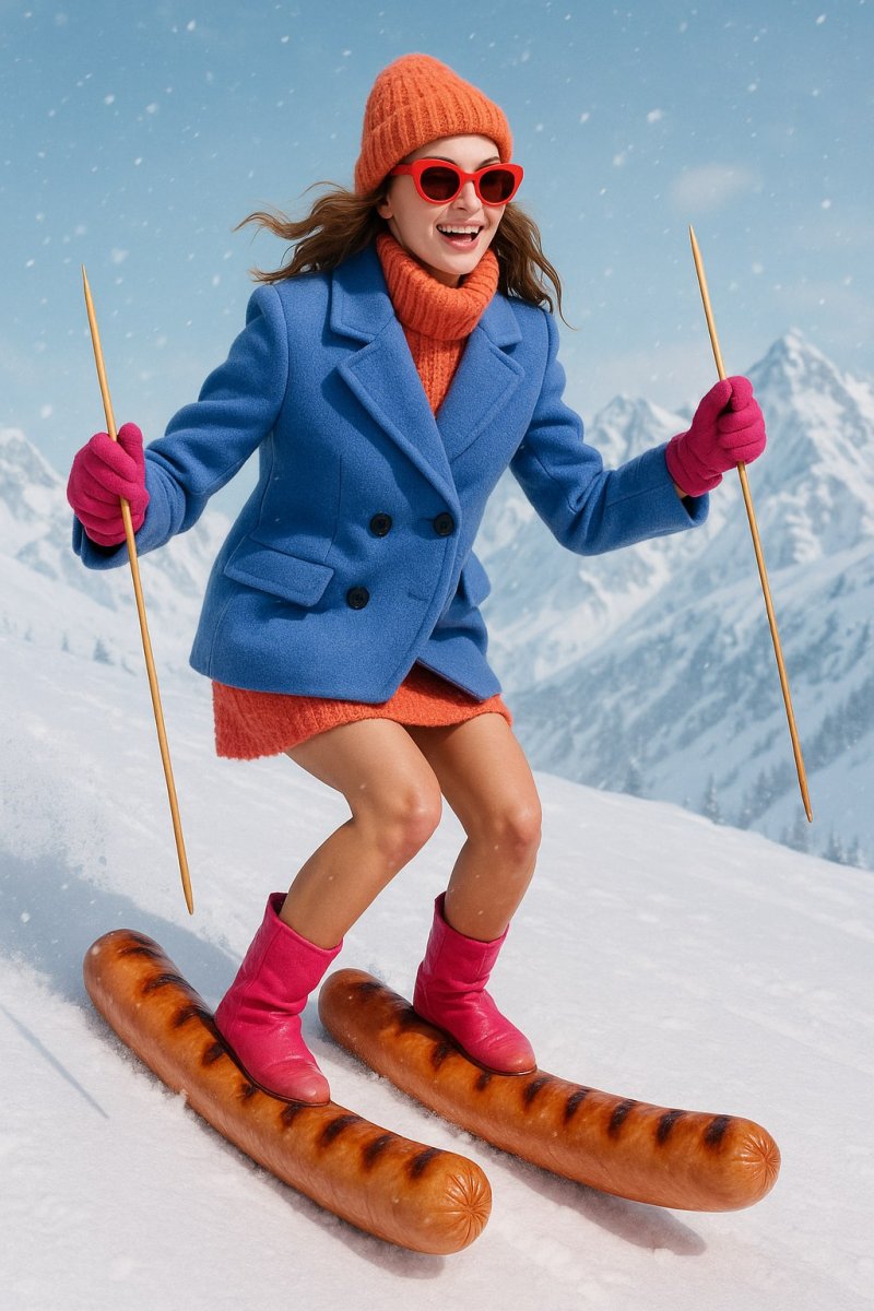 Девушка в ярком купальном костюме с беззаботным весельем мчится по заснеженному склону на двух огромных сосисках, словно это гигантские лыжи. Вместо привычных палок она ловко управляется с шампурами, используя их как импровизированные посохи для катания. Обстановка пропитана игривым настроением и сказочной атмосферой: вокруг мягко кружатся снежинки, а на заднем плане простирается заснеженный горный пейзаж, окутанный легкой дымкой мороза. Вся композиция излучает жизнерадостность, энергию и позитивные эмоции, создавая ощущение праздника и безграничной фантазии. Кажется, что это ожившая иллюстрация к детской сказке, где нет места скуке и обыденности, а только место для смеха, приключений и незабываемых впечатлений. Яркие цвета и динамичная поза девушки подчеркивают энергичность момента, делая эту сцену по-настоящему запоминающейся и вдохновляющей. Это настоящий гимн беззаботному веселью и творческому подходу к жизни, приглашающий зрителя окунуться в мир фантазий и позитива