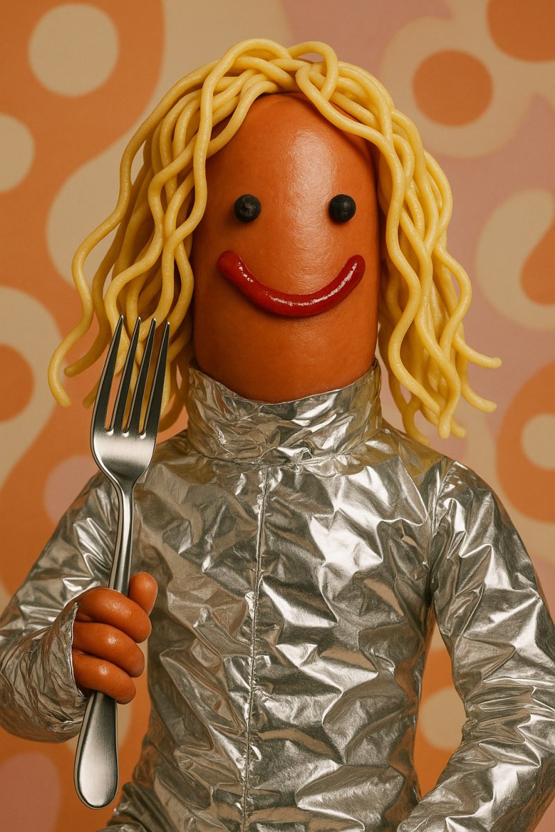 #2. close-up of whimsical character, sausage wearing shiny foil outfit, long noodle curls as hair, peppercorn eyes and ketchup smile, performing with a fork in hand, playful backdrop. #role_stuff