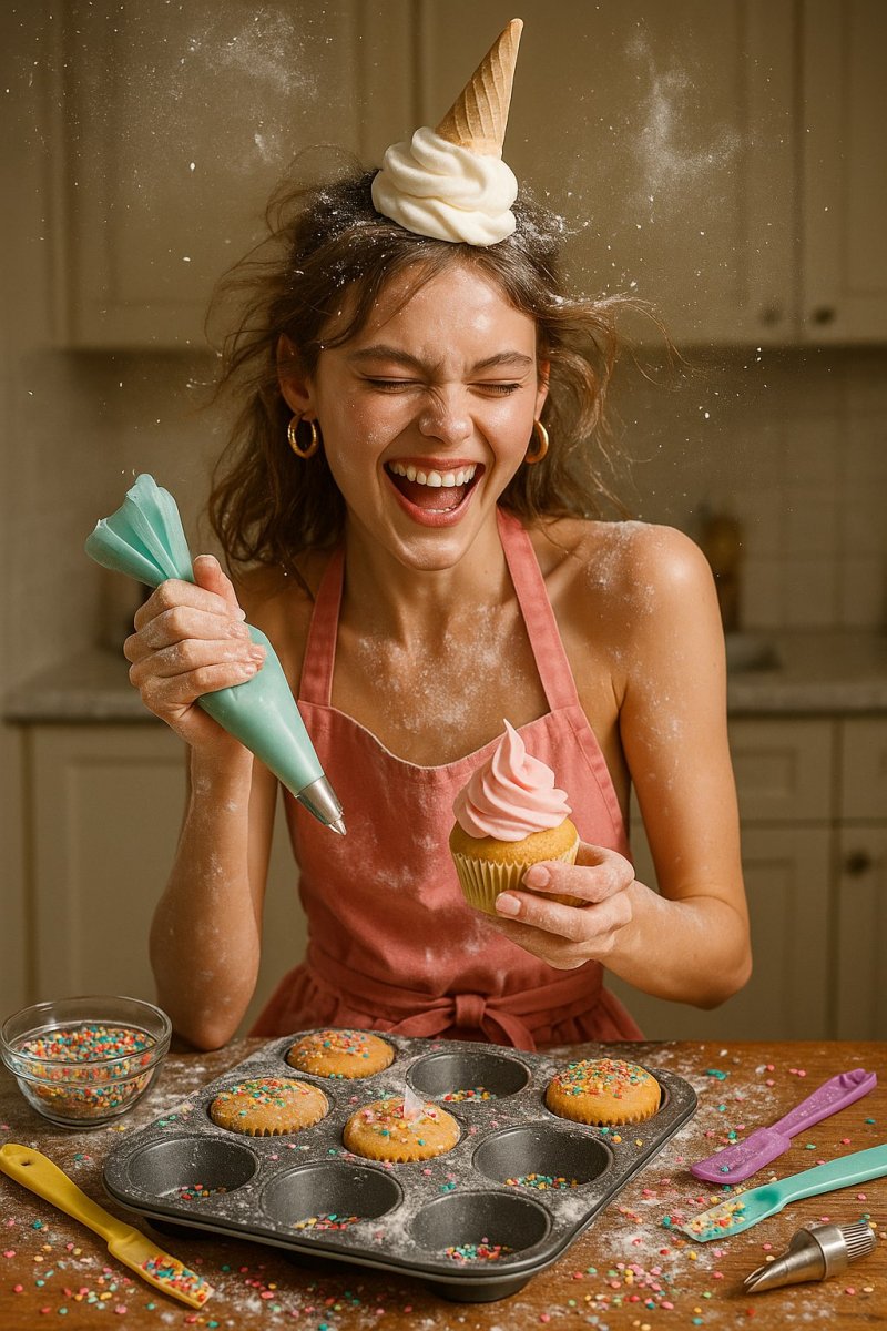 playful scene of a squirrel in a tiny apron, enthusiastically baking cupcakes, flour flying everywhere, kitchen countertop cluttered with colorful sprinkles and icing tools, soft-serve ice cream cone as a hat, creative and amusing essence.