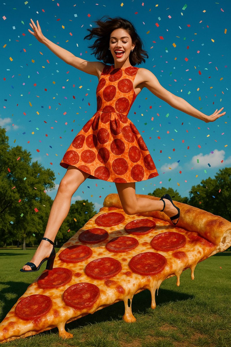 4. lively image of a young girl playfully jumping onto a giant pizza slice in a park, dressed in a dress covered with pepperoni patterns, confetti flying around, cheerful atmosphere with a blue sky backdrop.