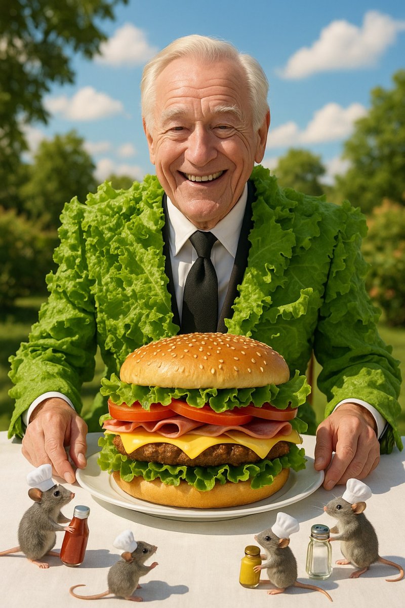 1. high-quality image of a cheerful elderly man wearing a suit made of lettuce, sitting at a table with a giant sandwich, surrounded by tiny mice in chef hats passing condiments, light and joyful atmosphere with a sunny outdoor setting.