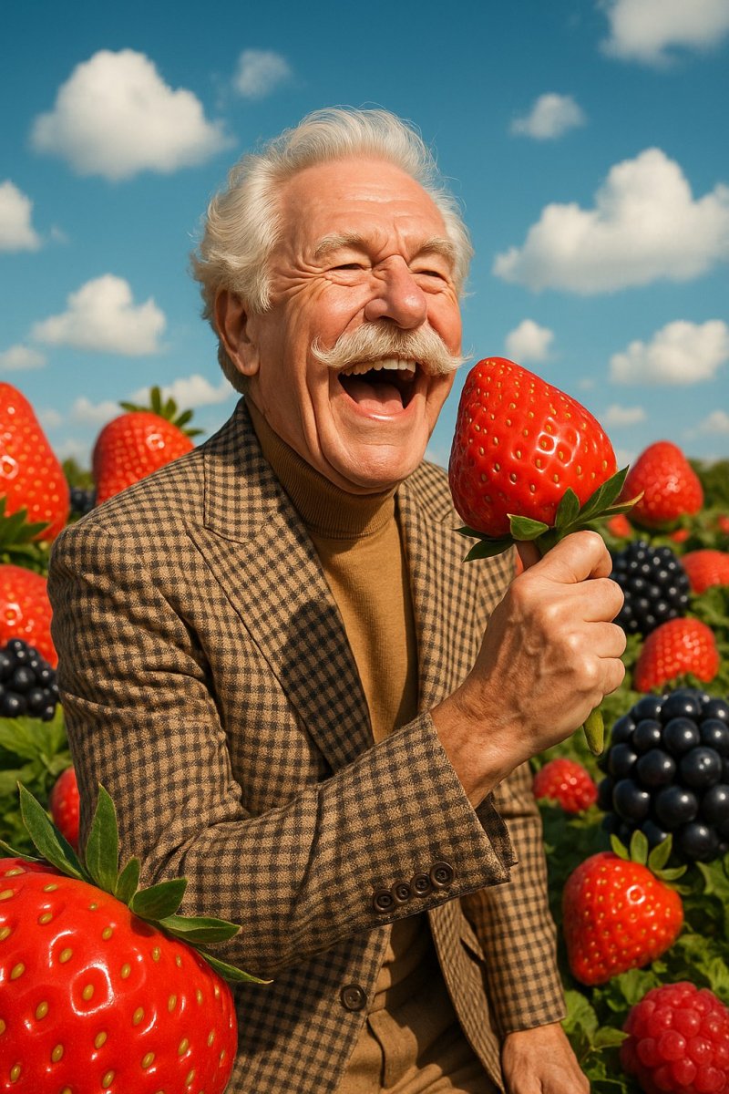 4. high-quality portrait of a happy old man with a bushy mustache, holding a giant strawberry like a microphone, singing joyfully in a field of giant fruits, bright blue sky above with fluffy clouds, whimsical and humorous atmosphere.