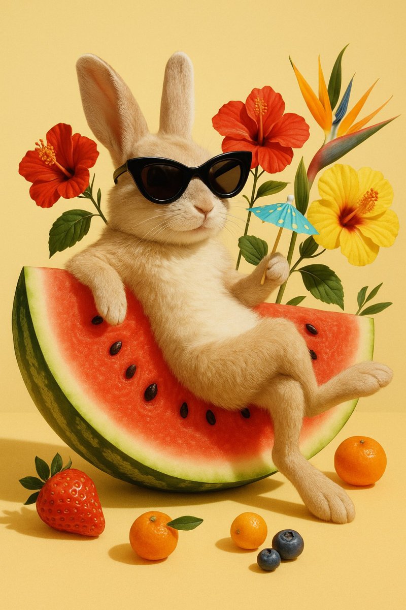 2. amusing scene of a rabbit in sunglasses relaxing on a giant slice of watermelon, holding a tiny cocktail umbrella in one paw, surrounded by small fruits and vibrant floral decorations, the atmosphere is light-hearted and sunny.