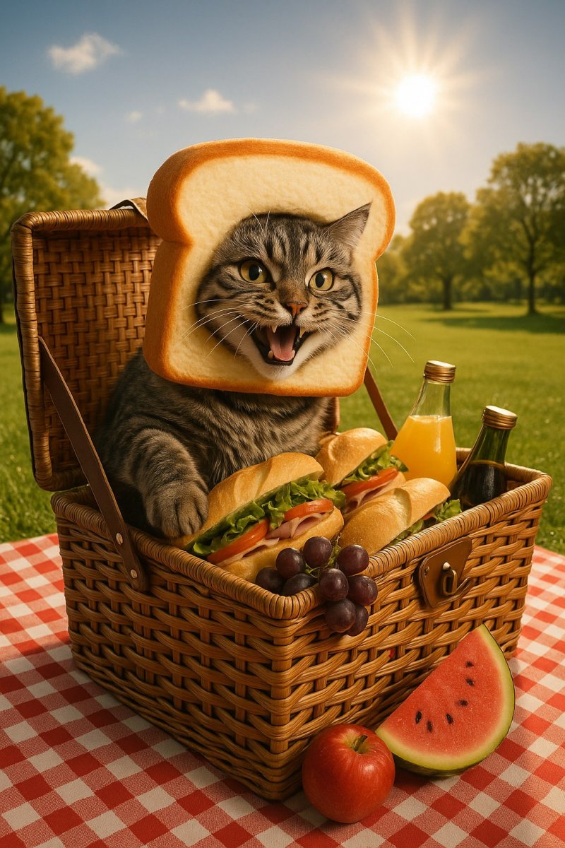 4. high-quality image of a mischievous cat wearing a bread loaf costume, peeking out from inside a large picnic basket filled with sandwiches, fruits, and drinks, with a joyful park setting in the background and a sun shining brightly above.