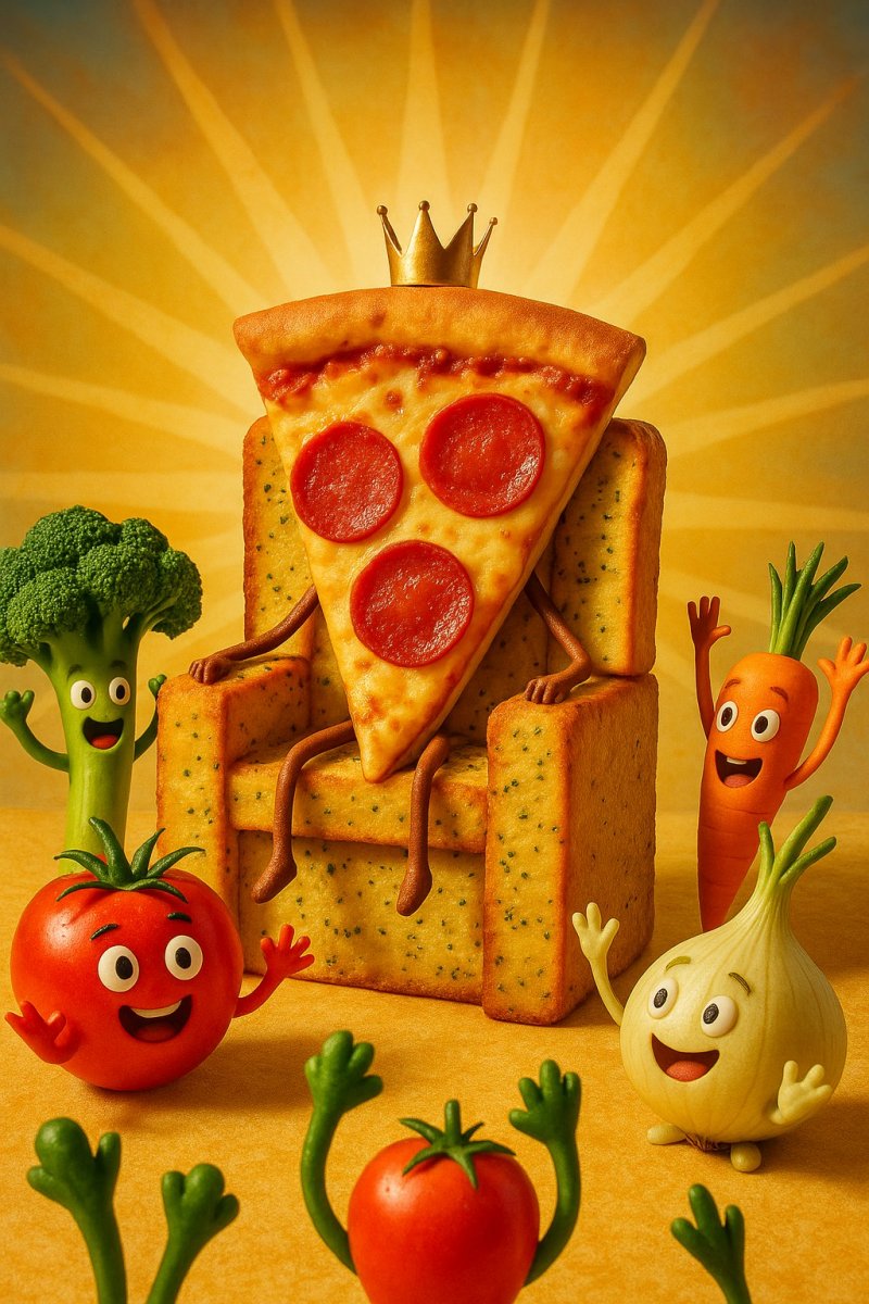 Пицца-король и овощные подданные: Весёлое торжество вкуса. Изображение из нейронной сети Sora images Ai