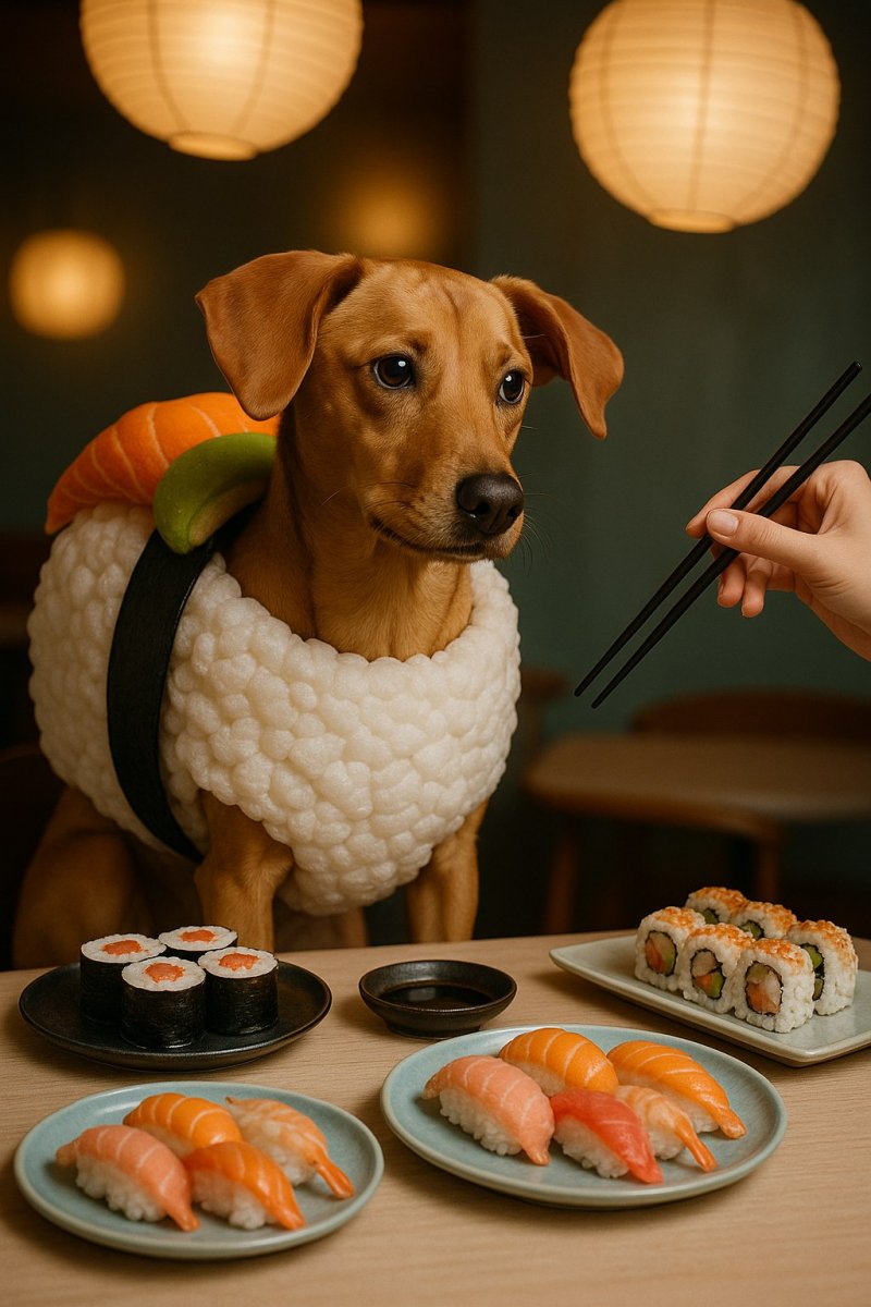 Забавный пёс в костюме суши за обеденным столом. Картинка из нейронной сети Sora