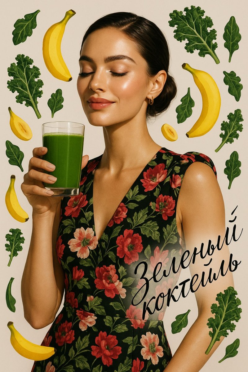 На изображении представлена элегантная женщина с сияющей кожей, демонстрирующая бокал яркого зеленого смузи. Она одета в стильное платье с цветочным принтом и окружена динамичными графическими элементами – летающими изображениями бананов и листьев капусты, что создает атмосферу энергии и жизнерадостности. Рядом с ней изящным шрифтом подпись 'зеленый коктейль', приглашающая ощутить вкус натуральной энергии и молодости. Картина передает ощущение гармонии с природой, внутренней силы и подчеркивает важность здорового питания для красоты и здоровья кожи. Доминирующий зеленый цвет символизирует свежесть, рост и жизненную энергию, наполняя сцену оптимизмом и позитивом. Вся композиция – это визуальное воплощение современного понимания красоты, основанного на здоровье и осознанности, мотивирующее к здоровому образу жизни и активной деятельности. Изображение создано с использованием нейросети Sora Images в стилях Fashion и Luxury, с высокой детализацией, демонстрируя сочетание элегантности, энергии и натуральных элементов для создания привлекательного и вдохновляющего образа.