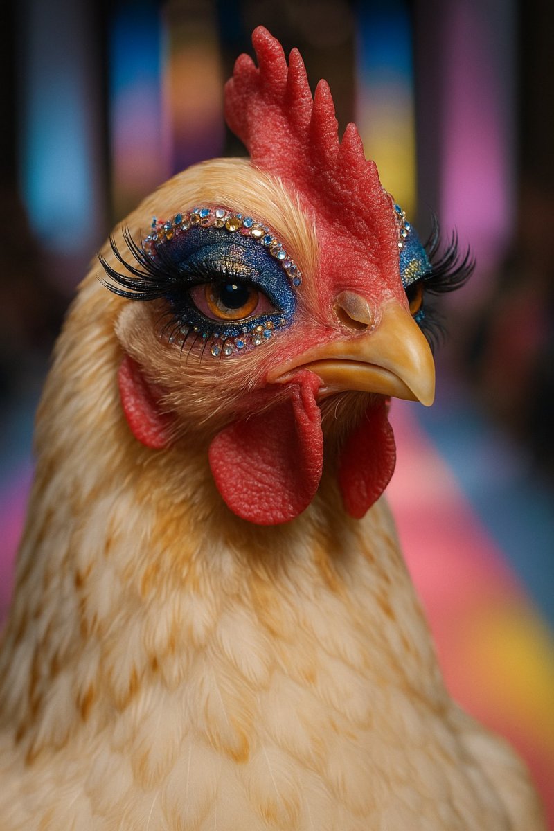 Fashion chicken, chicken’s eyes adorned with intricate eye makeup, featuring sparkling jewels and shimmering shadows, reflecting a colorful fashion runway, her lashes cascading dramatically, evoking a sense of artistry and elegance, bright lipstick на клюве.