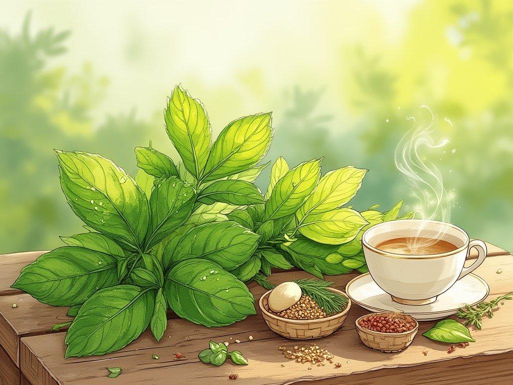 Создай иллюстрацию с изображением свежих веточек орегано и душицы, расположенных рядом друг с другом на деревянной поверхности. Листья крупные, ярко-зелёные, с каплями росы, отражающими естественный свет. Подчеркни текстуру листа и видимые жилки. Рядом расположи небольшие корзинки с сушёными пряностями и чайную чашечку с дымящимся напитком. Фон мягкий, слегка размазанный, создающий уютную атмосферу природы и домашнего тепла. Стиль иллюстрации — тёплый, натуральный, приближённый к реальности.