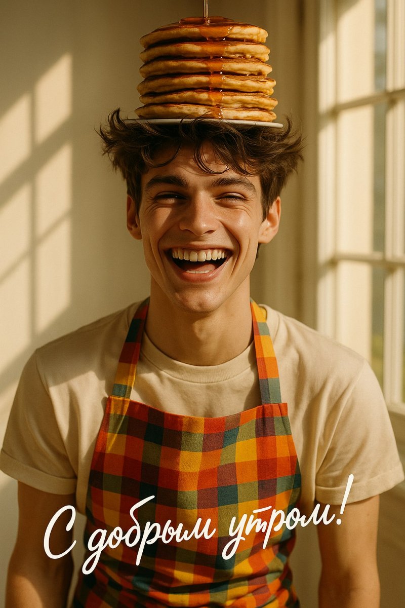 Беззаботное утреннее веселье запечатлелось в ярком снимке: молодой человек с растрепанными волосами широко улыбается, демонстрируя невероятную акробатическую выносливость – он ловко удерживает на голове высокую стопку аппетитных блинов, щедро политых ароматным сиропом. Его дополняет красочный фартук, добавляющий образу игривости и безмятежности. Мягкий солнечный свет, проникающий сквозь окно, создает теплую и уютную атмосферу, подчеркивая легкость и радость момента. Картина излучает позитив и оптимизм, словно приглашая зрителя присоединиться к этому забавному утреннему ритуалу. Подпись 'С добрым утром!', выполненная в жизнерадостном рукописном стиле, завершает композицию, наполняя ее искренним теплом и хорошим настроением. Этот образ - идеальное воплощение радостного начала дня, полного энергии и позитивных эмоций, побуждающее улыбнуться и встретить утро с энтузиазмом. Забавное действо создает ощущение спонтанности и беззаботности, напоминая о простых удовольствиях жизни