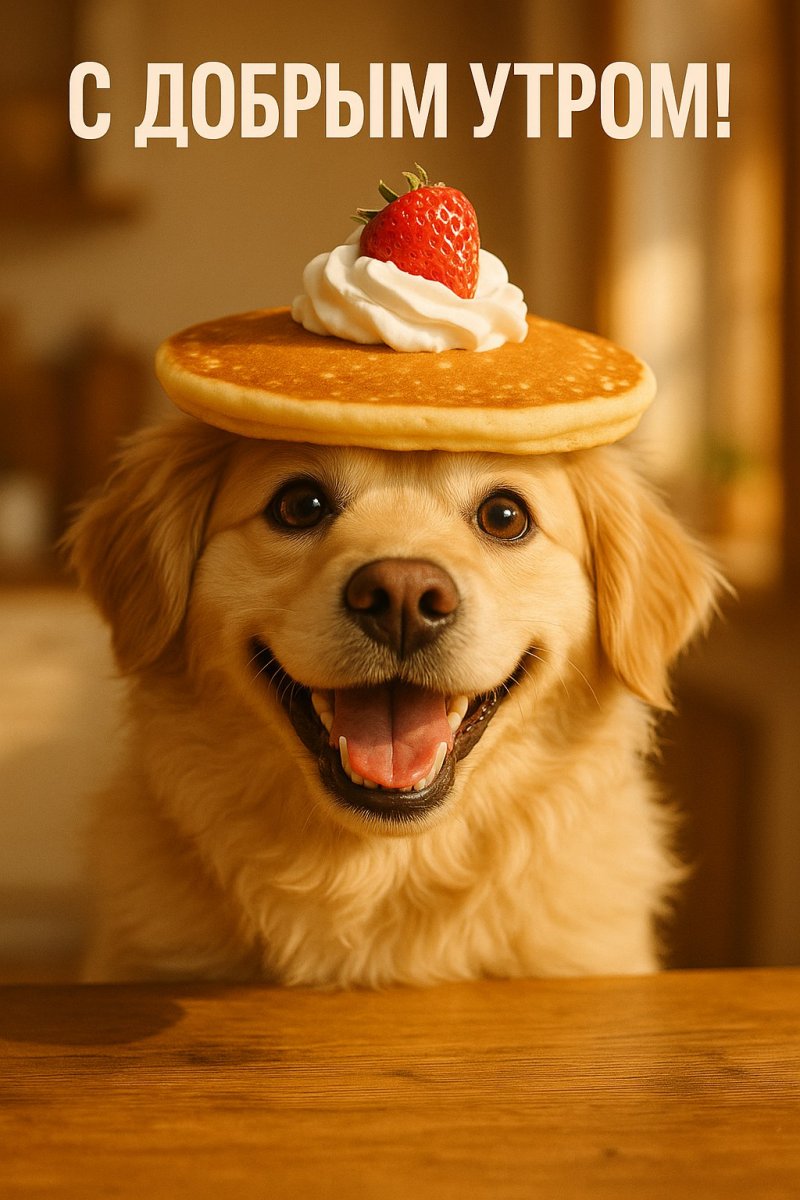 Утреннее чудо и безграничное счастье в одном кадре! Перед нами очаровательный пес, словно сбежавший с рекламного щита завтрака. Его мордочка светится искренней улыбкой, а на голове красуется восхитительная конструкция из пышного блинчика, украшенная взбитыми сливками и сочной клубникой – настоящий кулинарный шедевр для четвероногого гурмана! Широко раскрытые глаза полны восторга и предвкушения чего-то невероятно вкусного. Сцена разворачивается на уютном деревянном столе, залитом мягким утренним светом, который подчеркивает теплоту момента и создает атмосферу домашнего тепла. Вся композиция пронизана игривым настроением и беззаботной радостью – словно заглянули в самую счастливую секунду этого маленького друга. Над снимком красуется лаконичное пожелание С добрым утром!, которое идеально передает настроение утренней сказки, сотканной из любви, заботы и вкусного блинчика. Этот образ несомненно подарит улыбку каждому, кто увидит это чудесное фото – простое, но невероятно трогательное напоминание о прекрасных моментах, которые дарит нам каждое новое утро. Это квинтэссенция утреннего счастья и безграничной любви к нашим питомцам