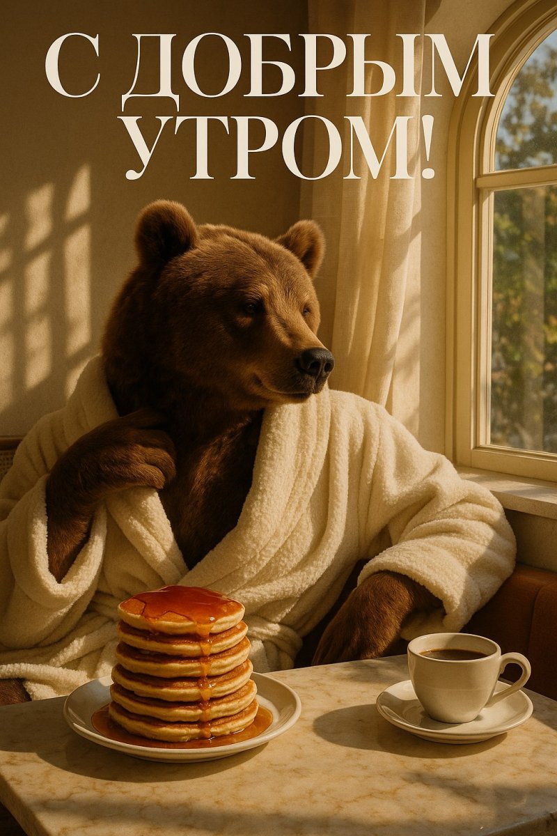 imaginative scene of a cozy breakfast nook featuring a bear in a bathrobe, lounging with pancakes stacked high, maple syrup dripping, playful squirrels peeking through the window, soft sunlight pouring in to create a magical morning feel, text in Russian "С добрым утром!"