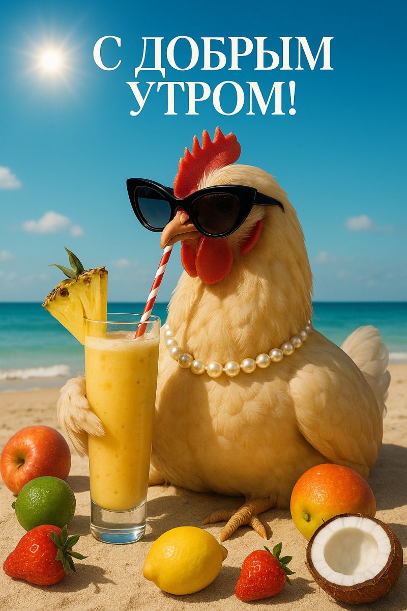 Невероятно очаровательное фото, демонстрирующее гламурную курицу в стильных солнцезащитных очках. Она наслаждается освежающим тропическим смузи прямо на песчаном пляже, окруженная ярким разнообразием экзотических фруктов, словно сошедших с картины райского уголка. Яркое солнце заливает все вокруг, создавая атмосферу беззаботности и поднимая настроение до небес. Безмятежное голубое небо над головой дополняет эту картину идеального летнего дня. На снимке присутствует русскоязычный текст 'С добрым утром!', добавляющий тепла и приветливости этому необыкновенному изображению, которое излучает позитив и вызывает улыбку одним своим видом. Эта фотография – настоящий взрыв красок и эмоций, сочетающий в себе юмор, стиль и летнее настроение, идеально подходящий для создания яркого визуального контента или просто для поднятия духа в пасмурный день. Это настоящее произведение искусства, демонстрирующее креативность и фантазию фотографа, сумевшего запечатлеть столь необычный и запоминающийся момент