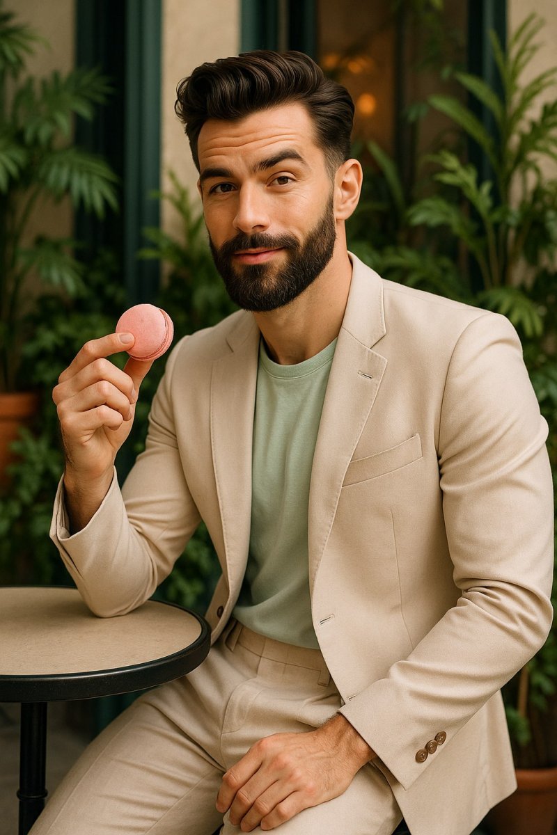 Portrait of a charismatic man with a perfectly groomed beard, wearing a light pastel suit, leaning casually against a stylish café table, a colorful macaron in hand, surrounded by lush greenery.