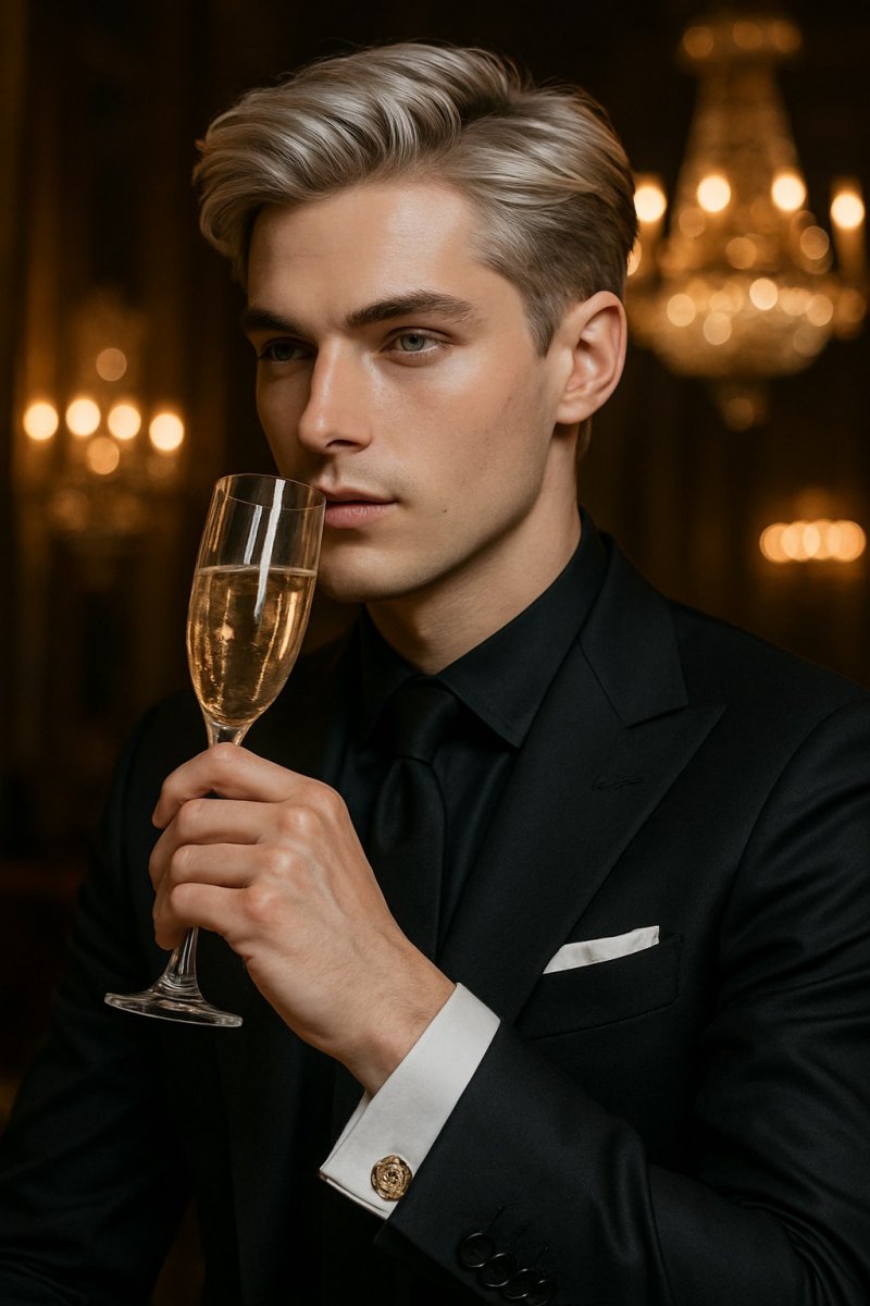 A glamorous young man with silver hair wearing a tailored black suit, holding a crystal clear glass of champagne, dim lit luxurious setting, intricate details on cufflinks featuring an abstract design, softly glowing background with vintage chandeliers.